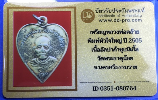 เหรียญพ่อท่านคล้าย วัดพระธาตุน้อย พิมพ์หัวใจใหญ่ แยกออกเป็น 2 พิมพ์ คือ พิมพ์จีวร ไม่มีจุด หรือ พิมพ์ ร.ใหญ่ กับ พิมพ์จีวร มีจุด หรือ พิมพ์ ร. เล็ก เหรียญนี้เป็นพิมพ์นิยมครับ เหรียญรุ่นนี้ออกวัดพระธาตุน้อยนครศรีธรรมราช เป็นอีกหนึ่งเหรียญที่น่าเก็บสะสมครับ สุดยอดพระดีพิธีใหญ่มากๆ ถือเป็นของดีที่น่าใช้อีกรุ่นหนึ่งครับ มาพร้อมบัตรรับรองครับ รับประกันตามกฏครับ